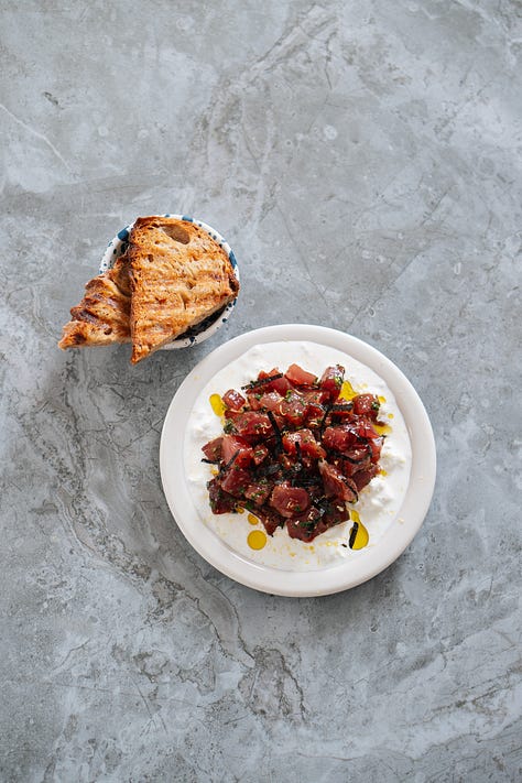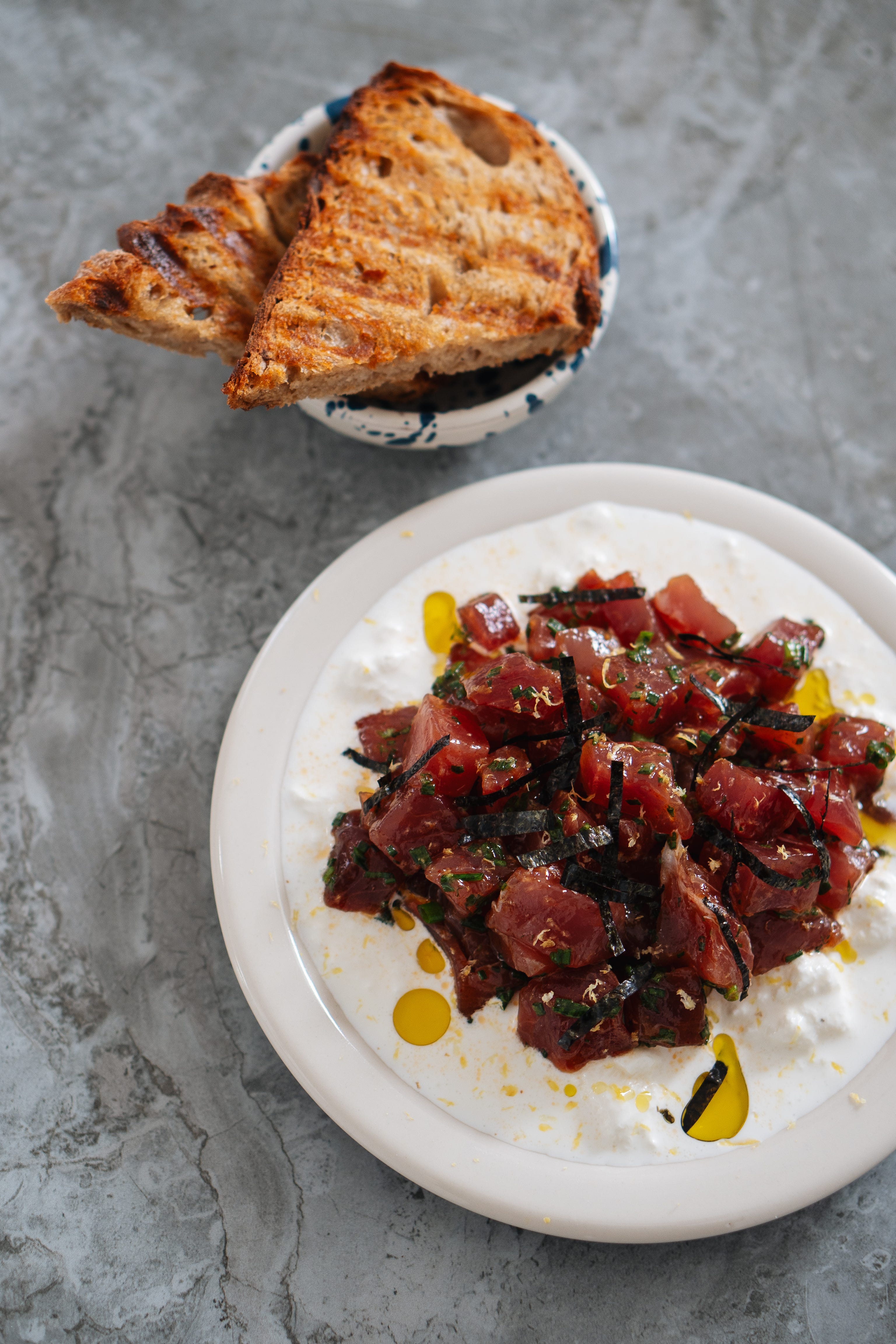 5. Die Stracciatella als Basis auf einem Teller verteilen, darauf den marinierten Thunfisch anrichten, mit Zitronenzeste, dem Schnittlauch und den anderen optionalen Toppings anrichten
